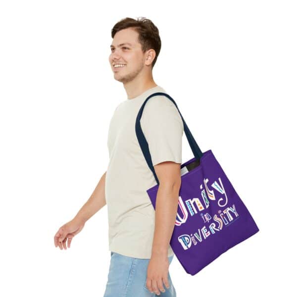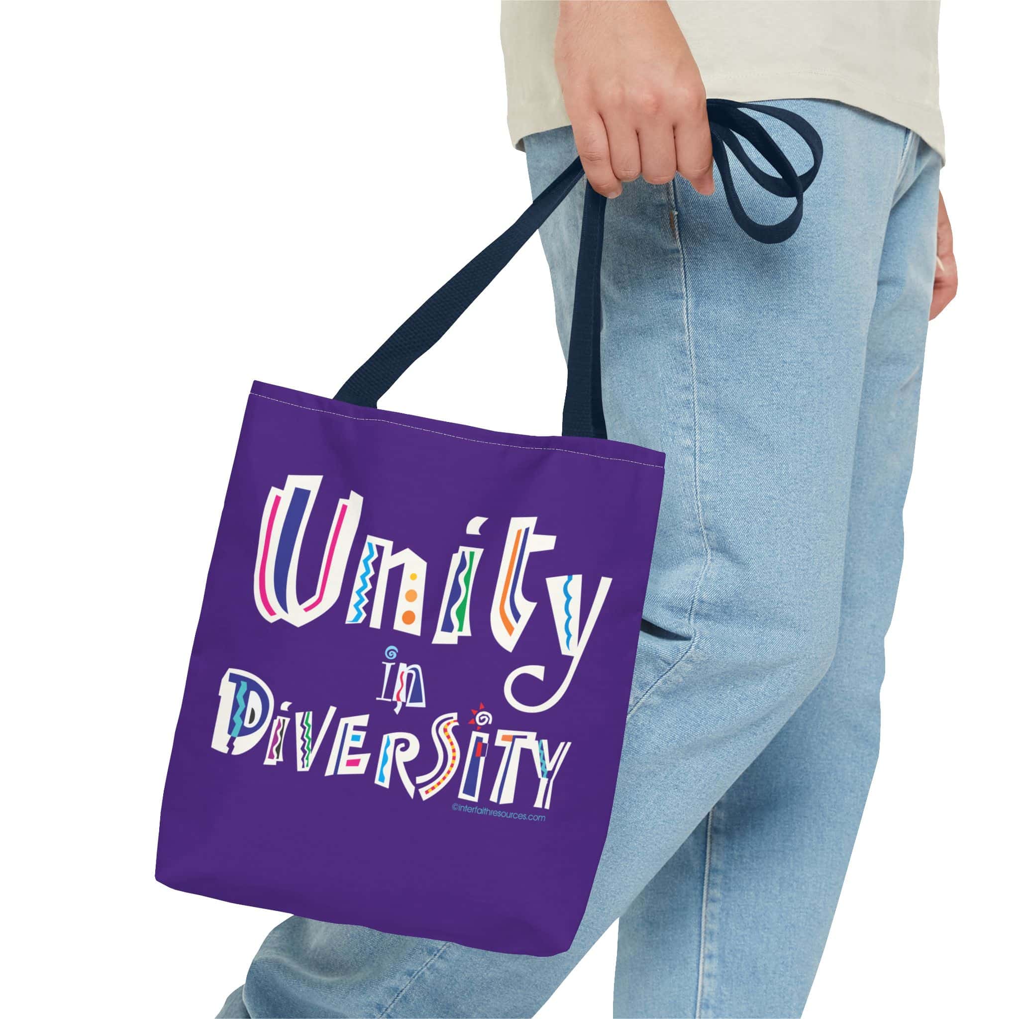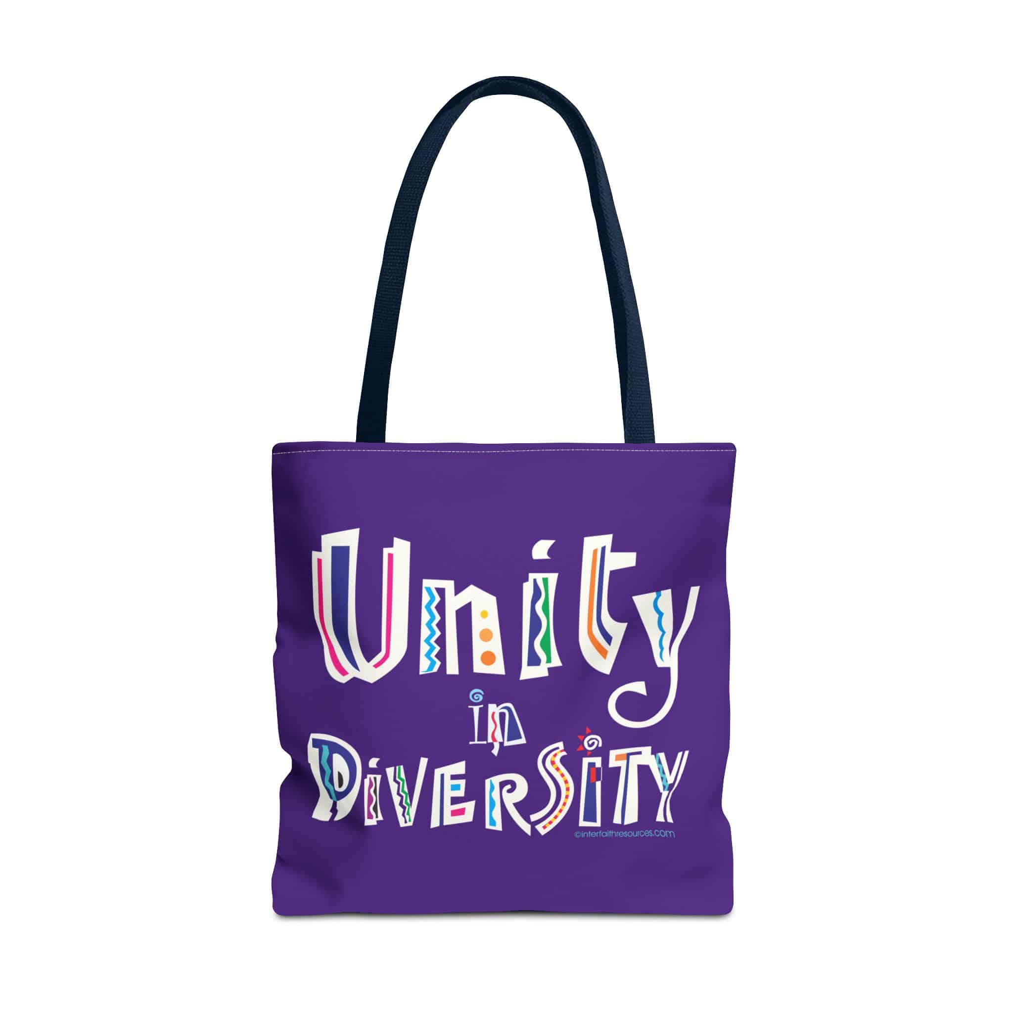 This deep purple Unity in Diversity Tote Bag virtually sings out its message in bright playful colors and a unique type font. It illustrates the concept that diversity is not just about skin color or nationality, but it embraces the full range of human variation – our thoughts, our styles, our personalities, our loves, our dreams.