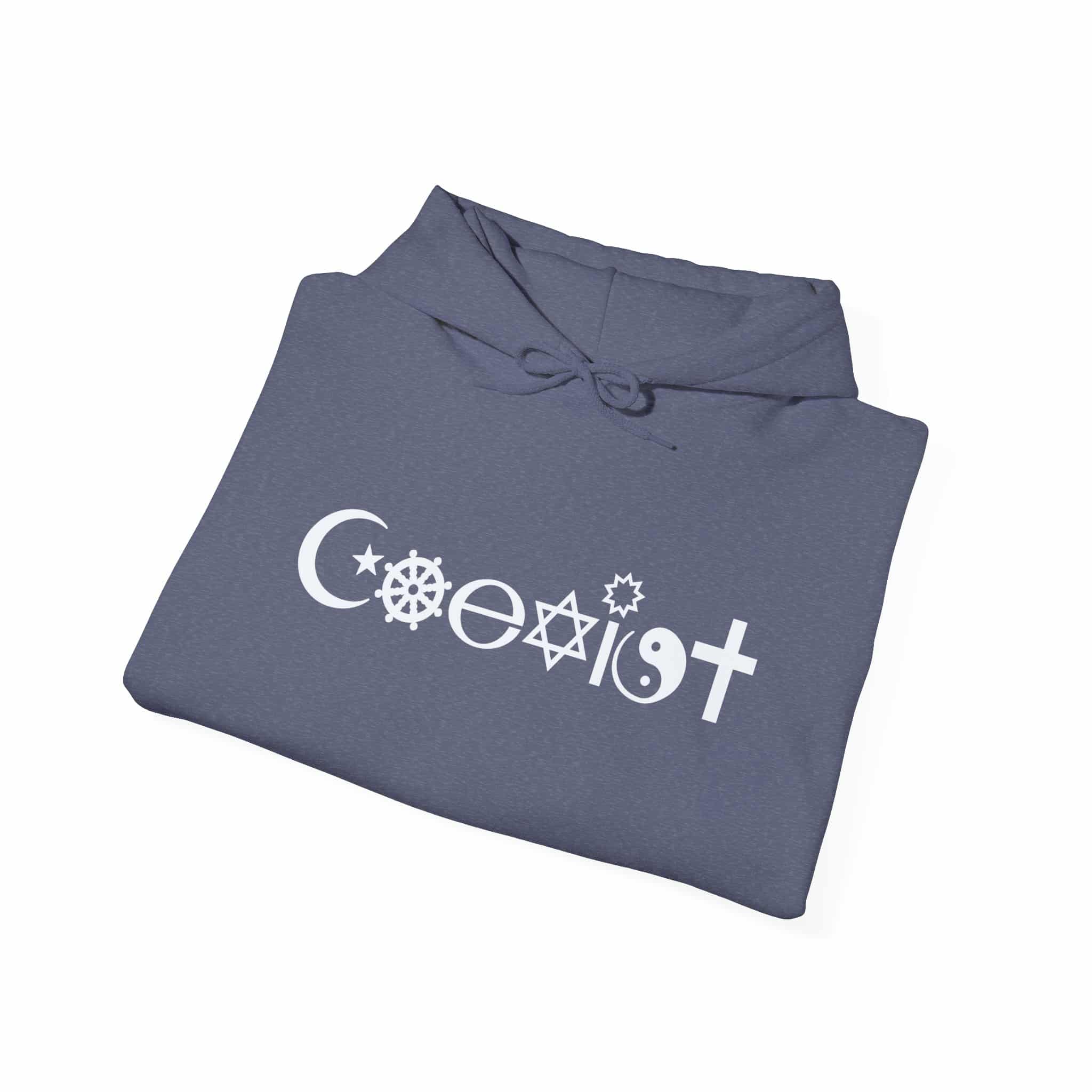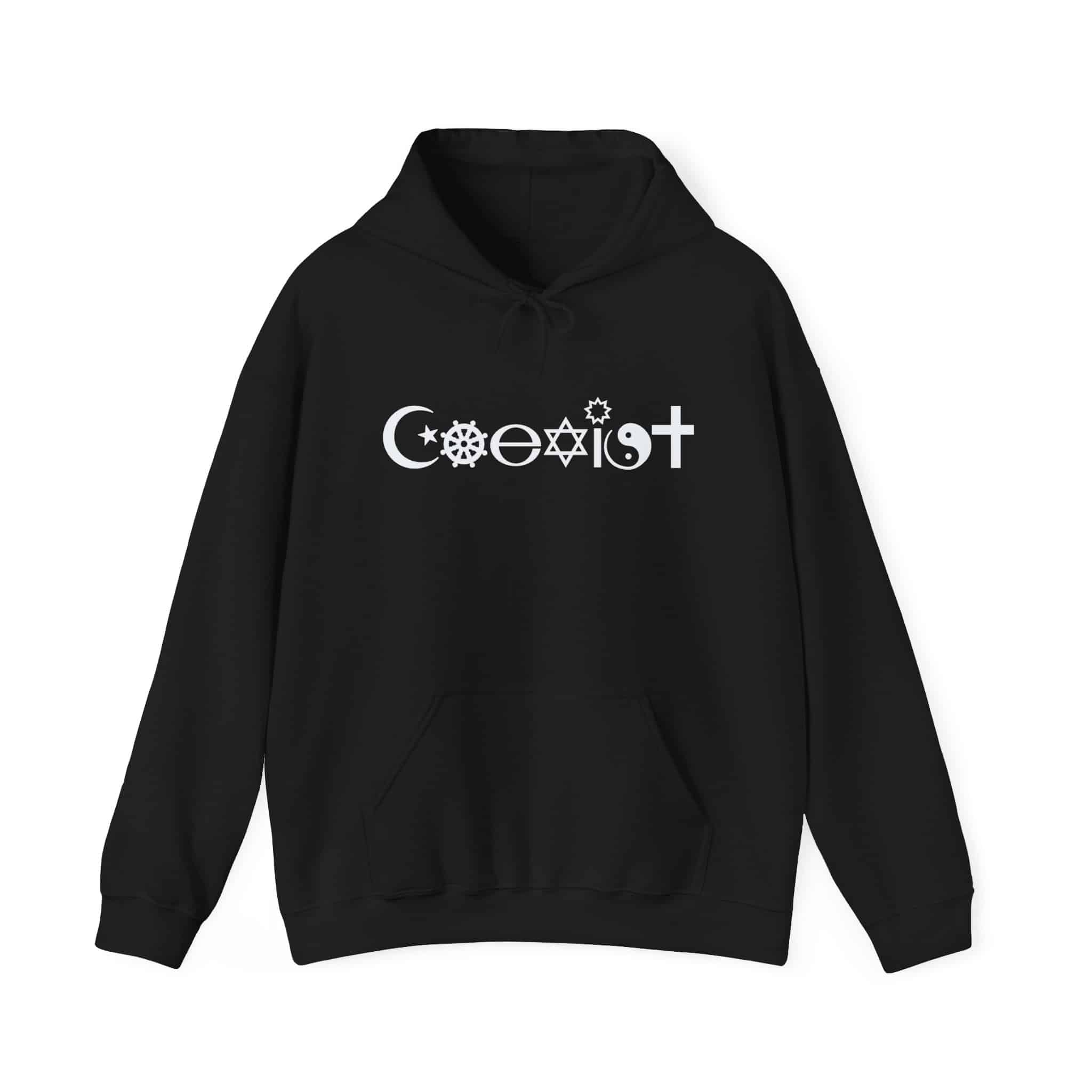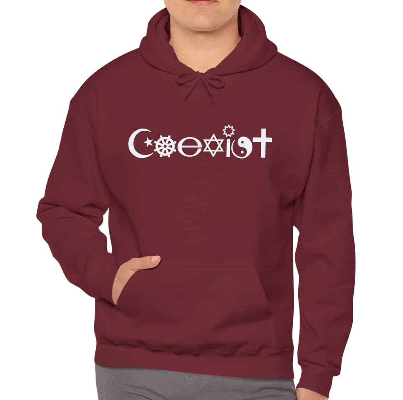 Since you are sure to be asked, here are the symbols on the coexist shirt: Crescent & Star for Islam makes the C, 8-fold path wheel for Buddhism makes the O, the Ecology Symbol forms the E, the Jewish Star is the X, a Baha’i Star is over the I, the Taoist Yin-Yang is for the S and the Christian cross for the T.This is a Print-on-Demand product, which is custom made specifically for you after you order it, so it is not returnable unless it is defective. Please check the sizing chart before ordering. They are shipped directly from our printing partners, so you will see a separate shipping charge listed at checkout. They may also take a few days longer to arrive.