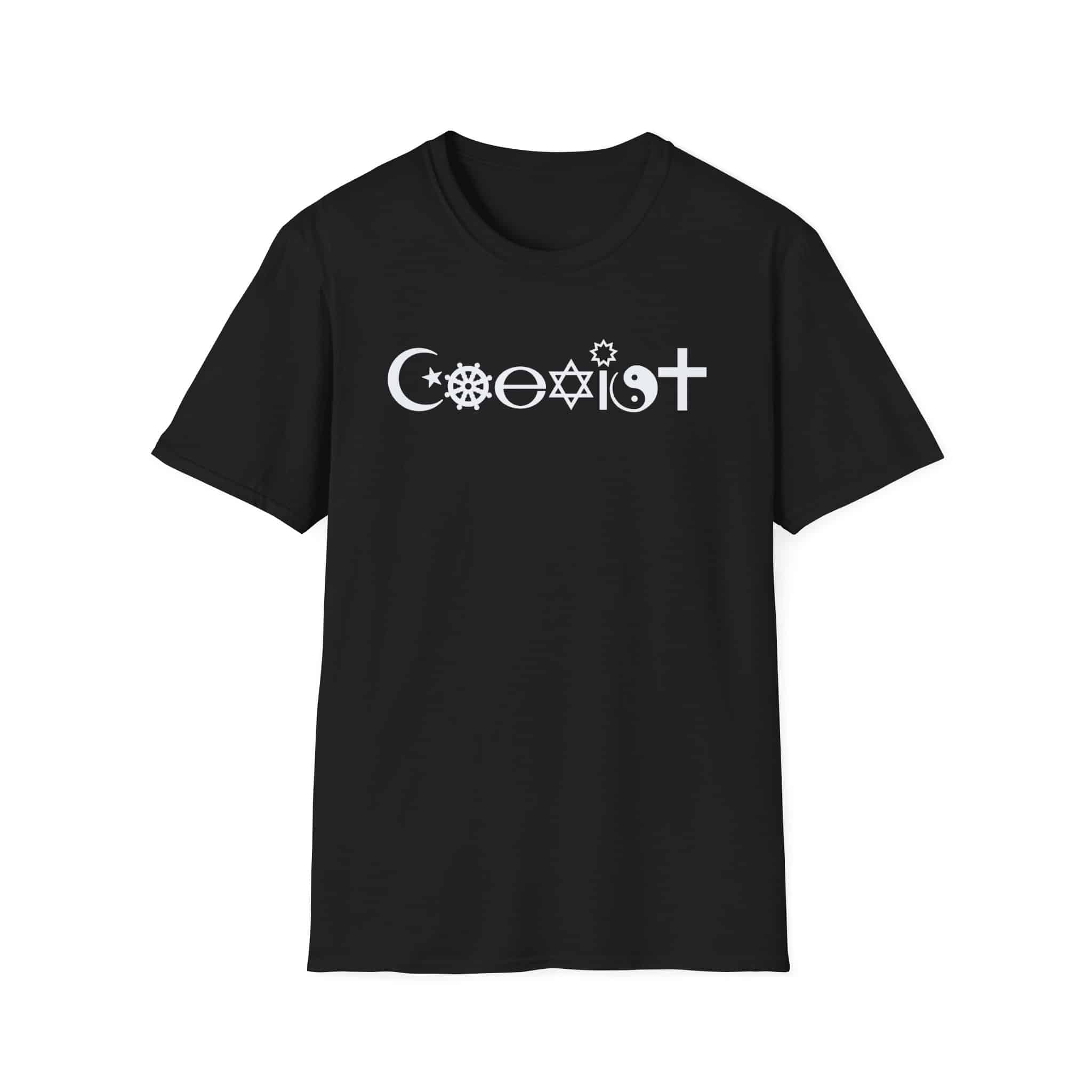 Since you are sure to be asked, here are the symbols on the coexist shirt: Crescent & Star for Islam makes the C, 8-fold path wheel for Buddhism makes the O, the Ecology Symbol forms the E, the Jewish Star is the X, a Baha’i Star is over the I, the Taoist Yin-Yang is for the S and the Christian cross for the T.