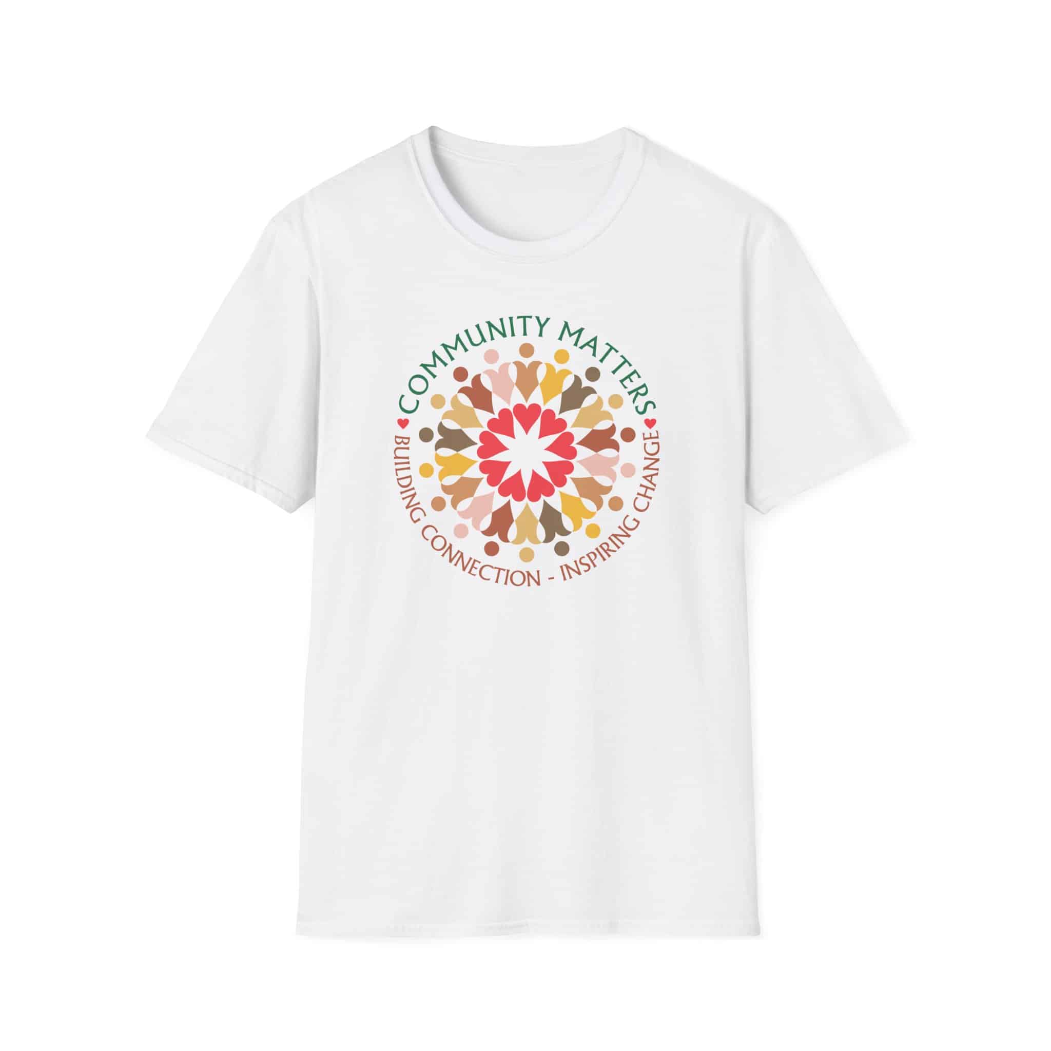 This design is a circle of multi-colored hearts that overlap to look like people with linked arms. The human skin tones reinforce the identification of the shapes as people, while the smaller circle of red hearts reinforce that they are connected in love.
