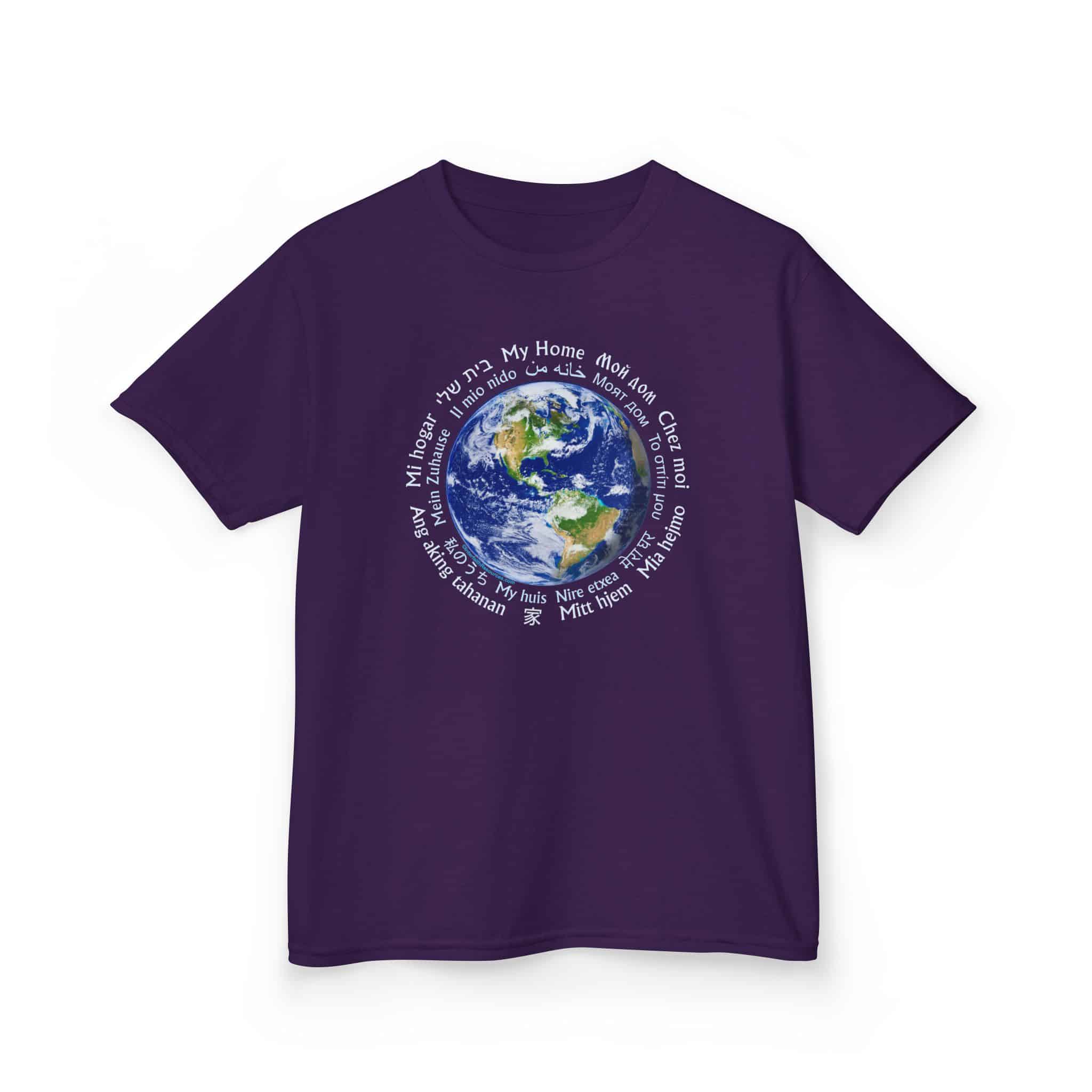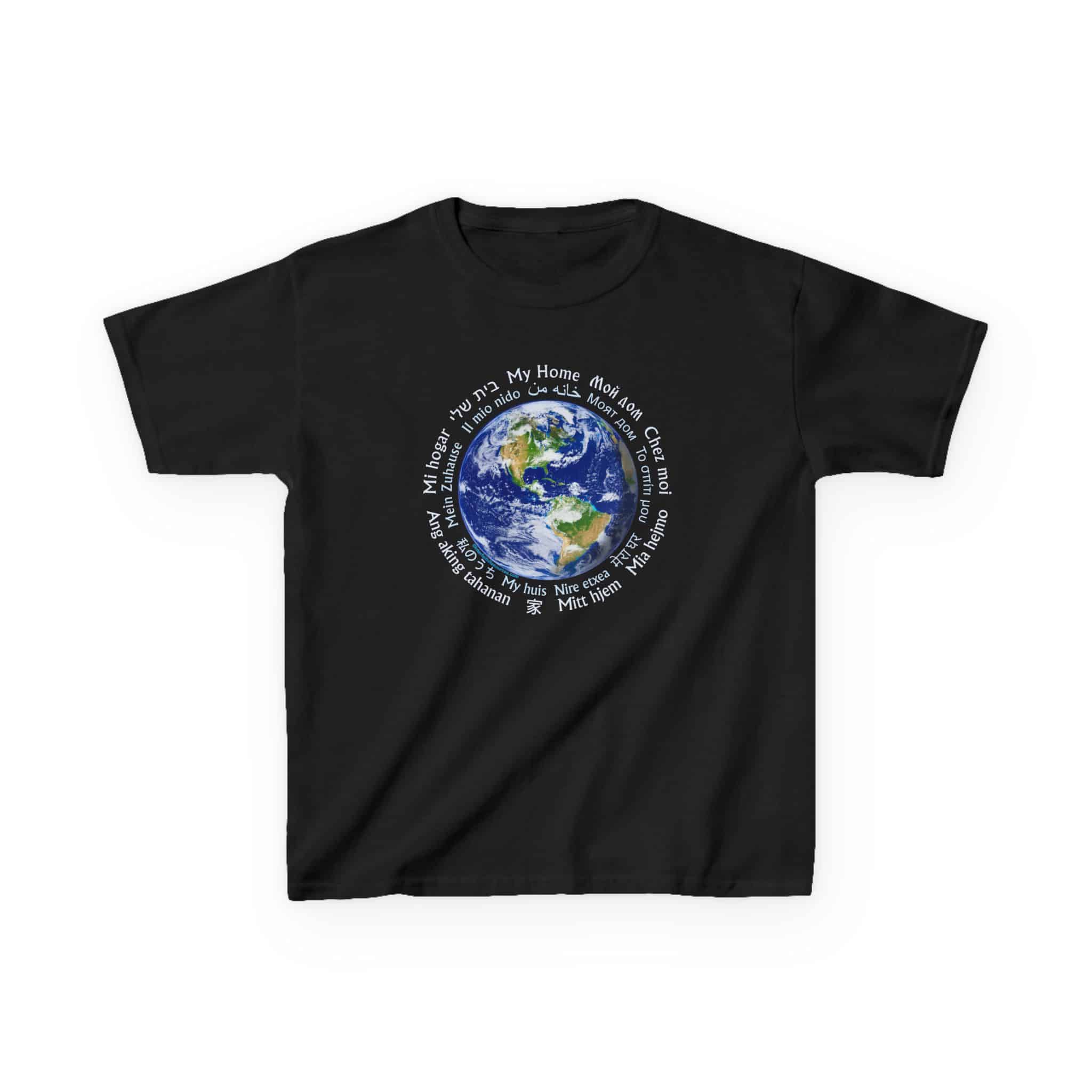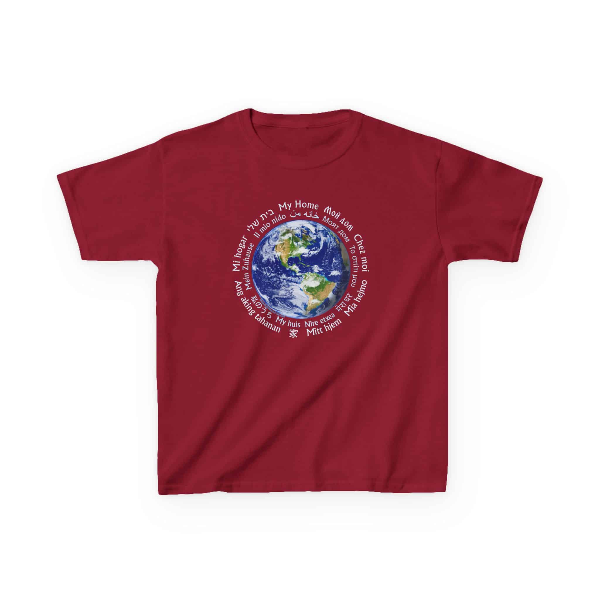 This shirt is a great conversation piece at school or on a playground. It is a real challenge trying to figure out all of the different languages used. The nice thing is that they all say the same thing: My Home.