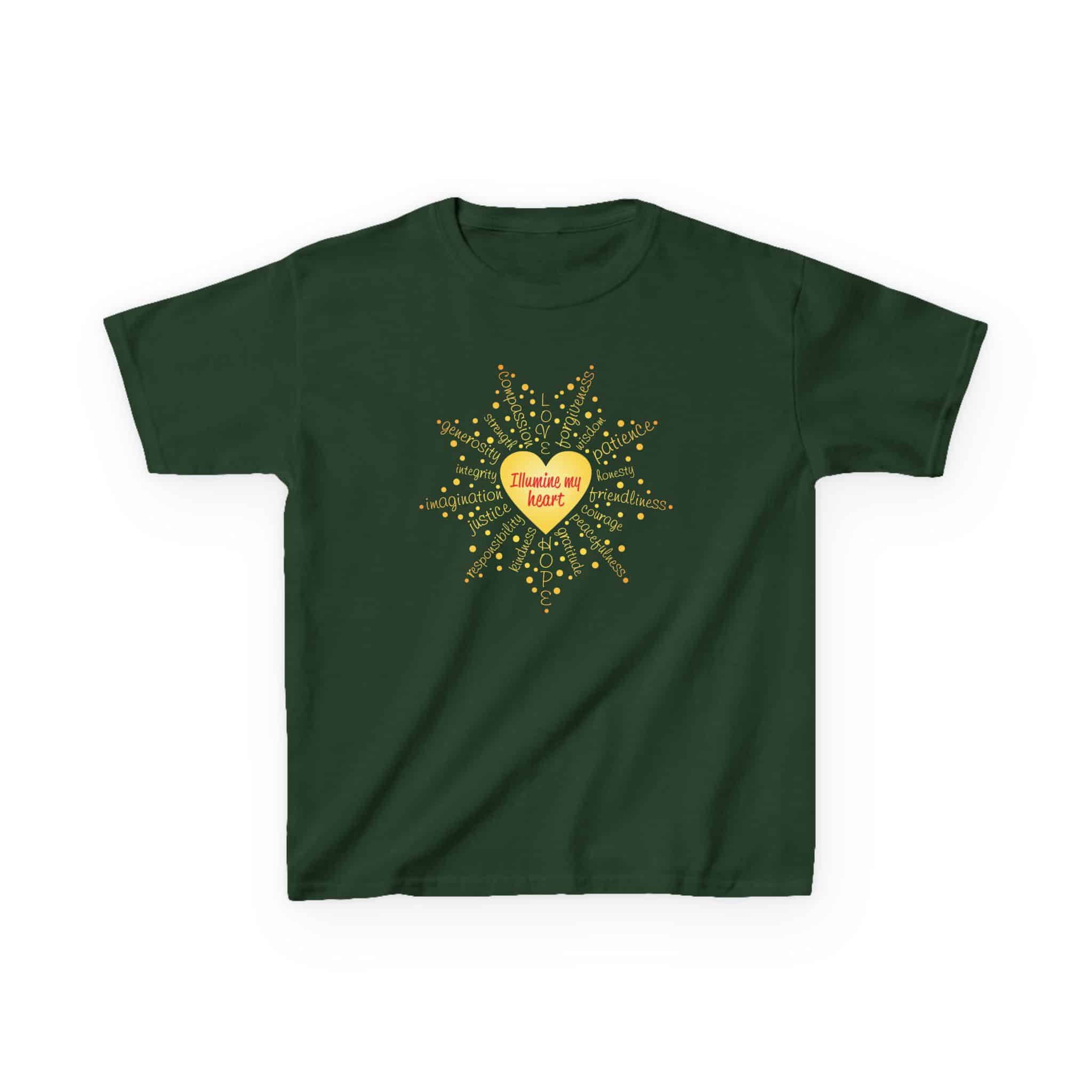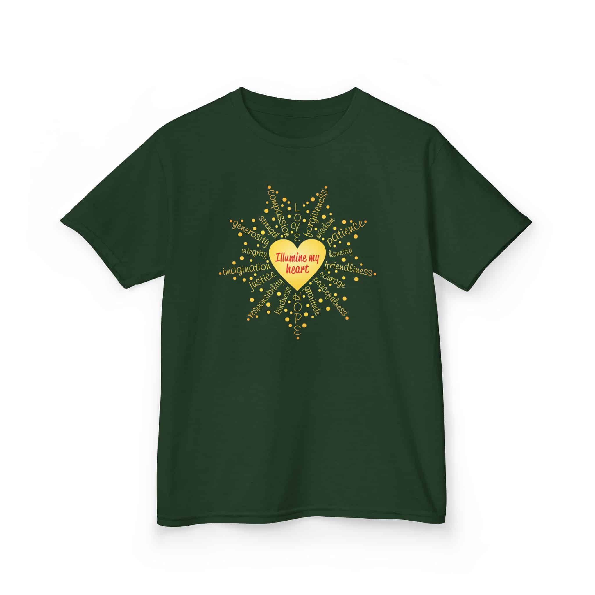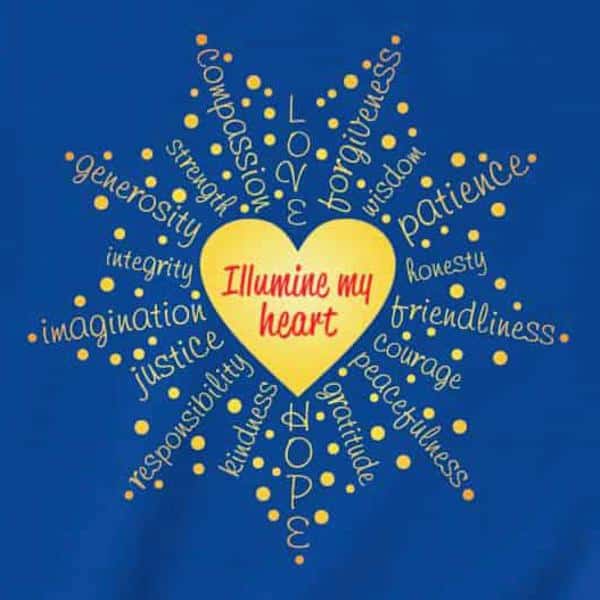 This cheerful shirt reminds all of us that it is our virtues that make our hearts shine. The design includes the names of 18 virtues radiating from a big yellow heart, creating a nine-pointed star.