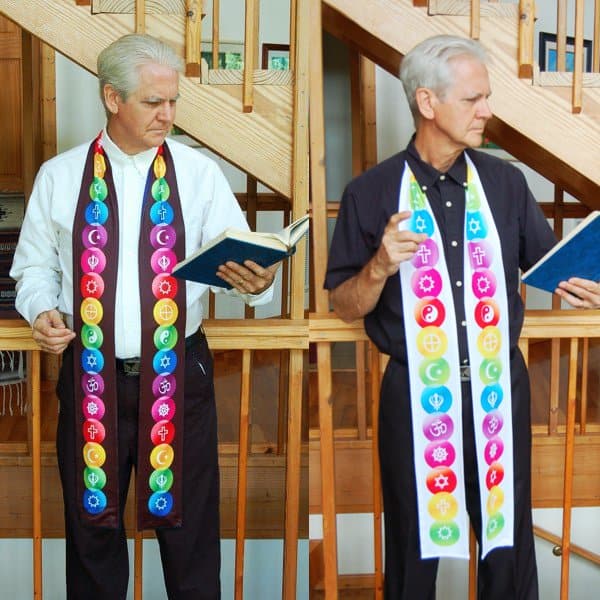 These are light-weight low-cost stoles that you can wear when performing a religious service. They are a beautiful way to indicate that you are a chaplain or clergy who can offer spiritual comfort to people of any religious background. The nine different religious symbols in the rainbow-colored design let people know that you respect every faith tradition. Religions represented include: Christian, Jewish, Islam, Buddhism, Baha’i, Hinduism, Taoism, Sikh, and Native American religions. The Multifaith theme is an important one to acknowledge in a multi-faith world.