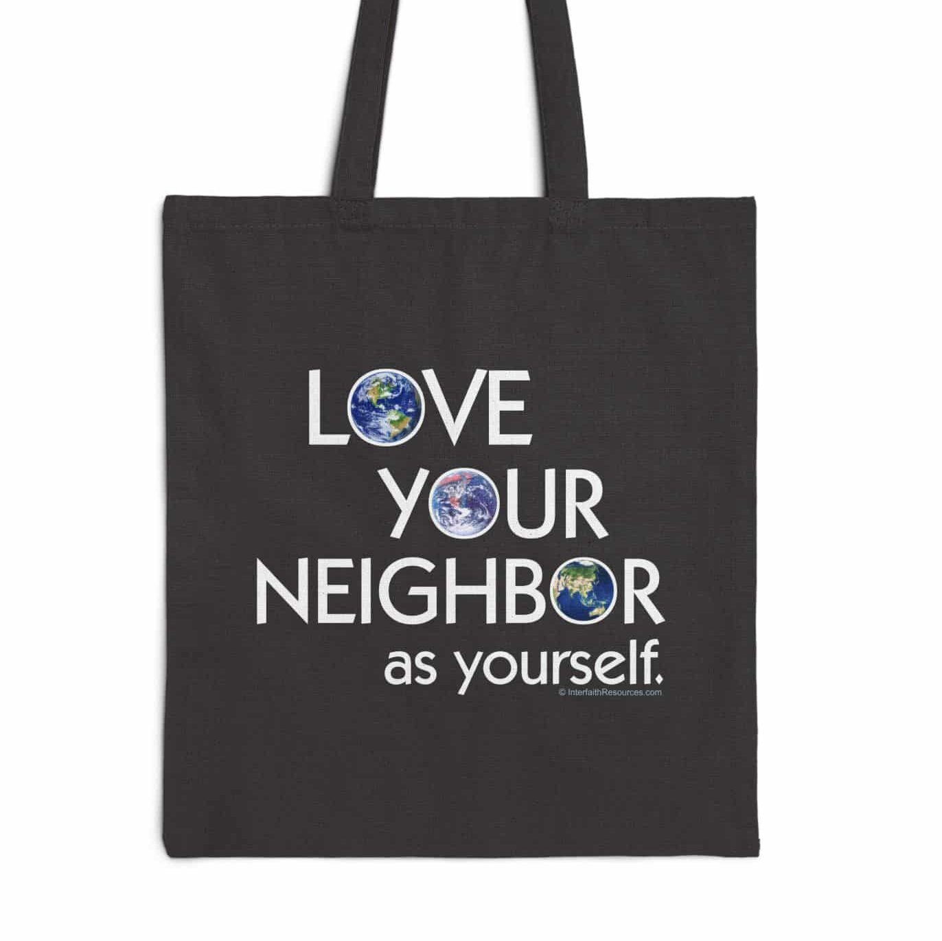 There seems to be some confusion as to who is meant by the word “neighbor.” This design clears up any doubt by including a picture of the entire globe within the “Os” of the words.