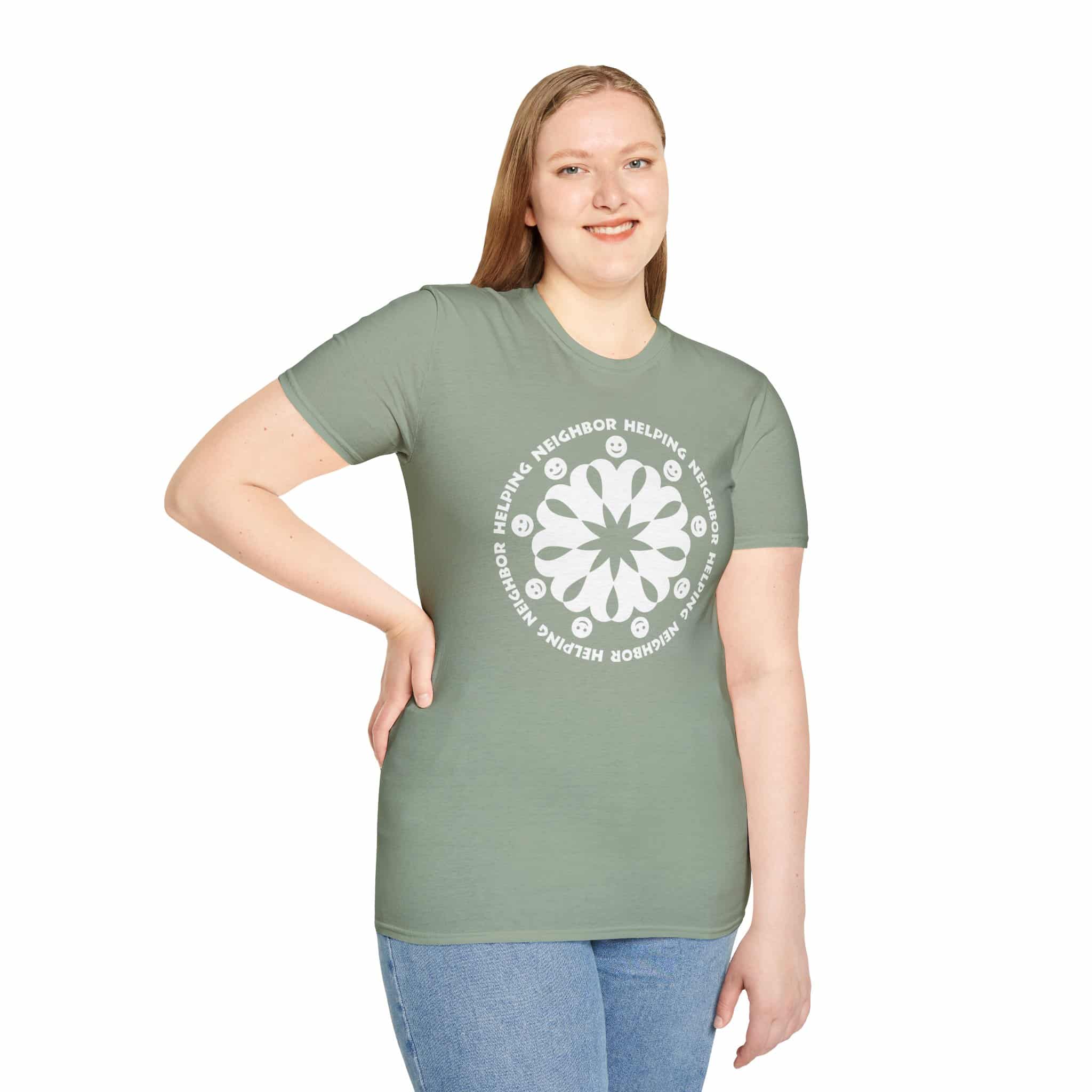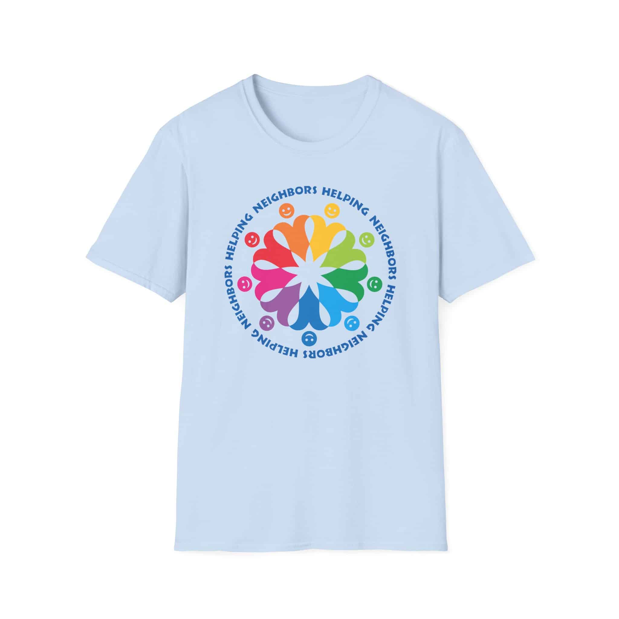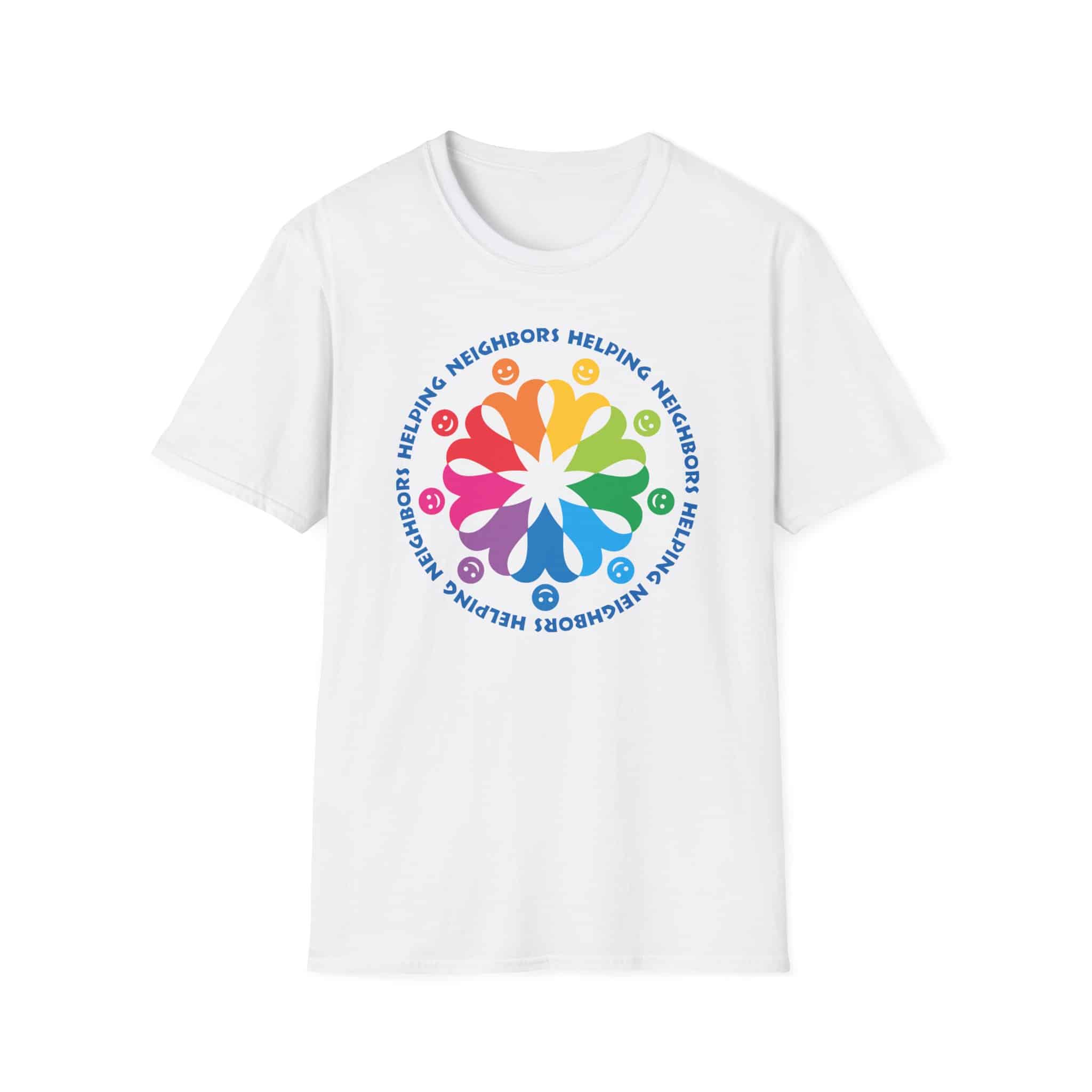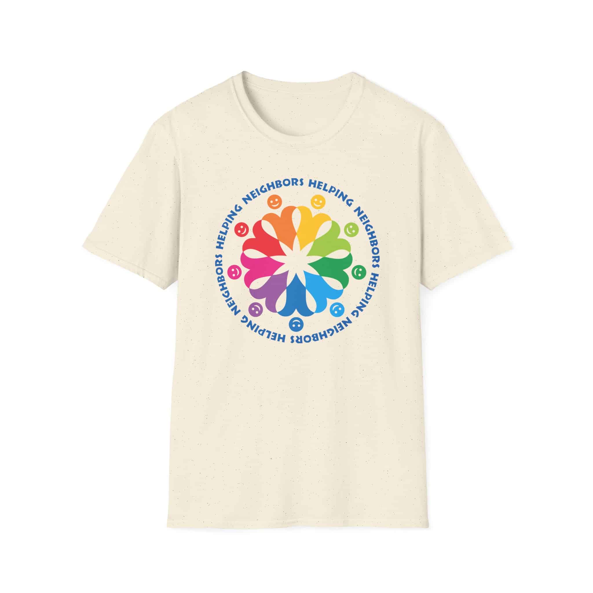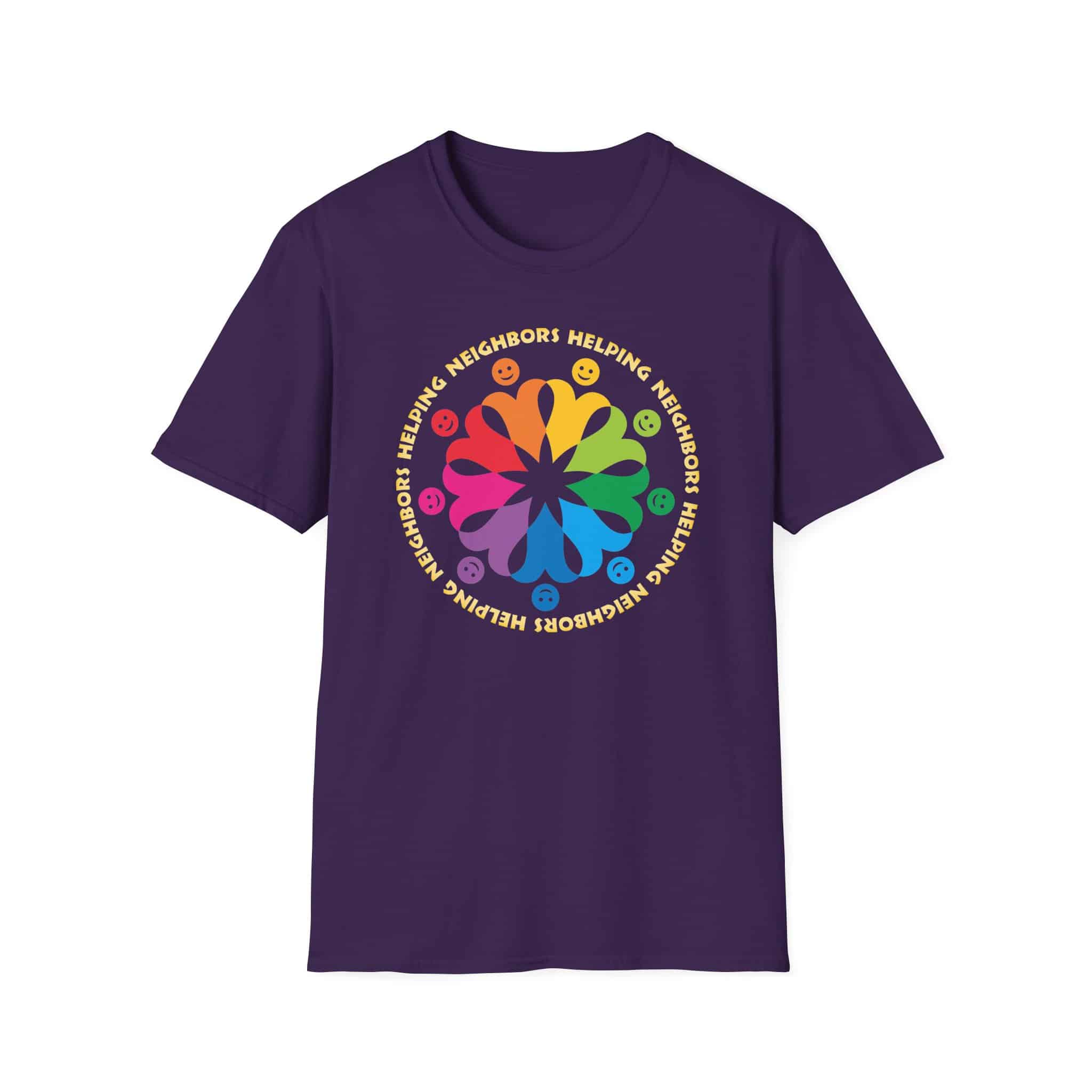 “Neighbors” calls to mind community action, while “Neighbor” reminds us that each one of us can assist our neighbors as individuals without waiting for a group to direct us. Both messages are important. Choose which one you prefer based on the color of the T-shirt you order.