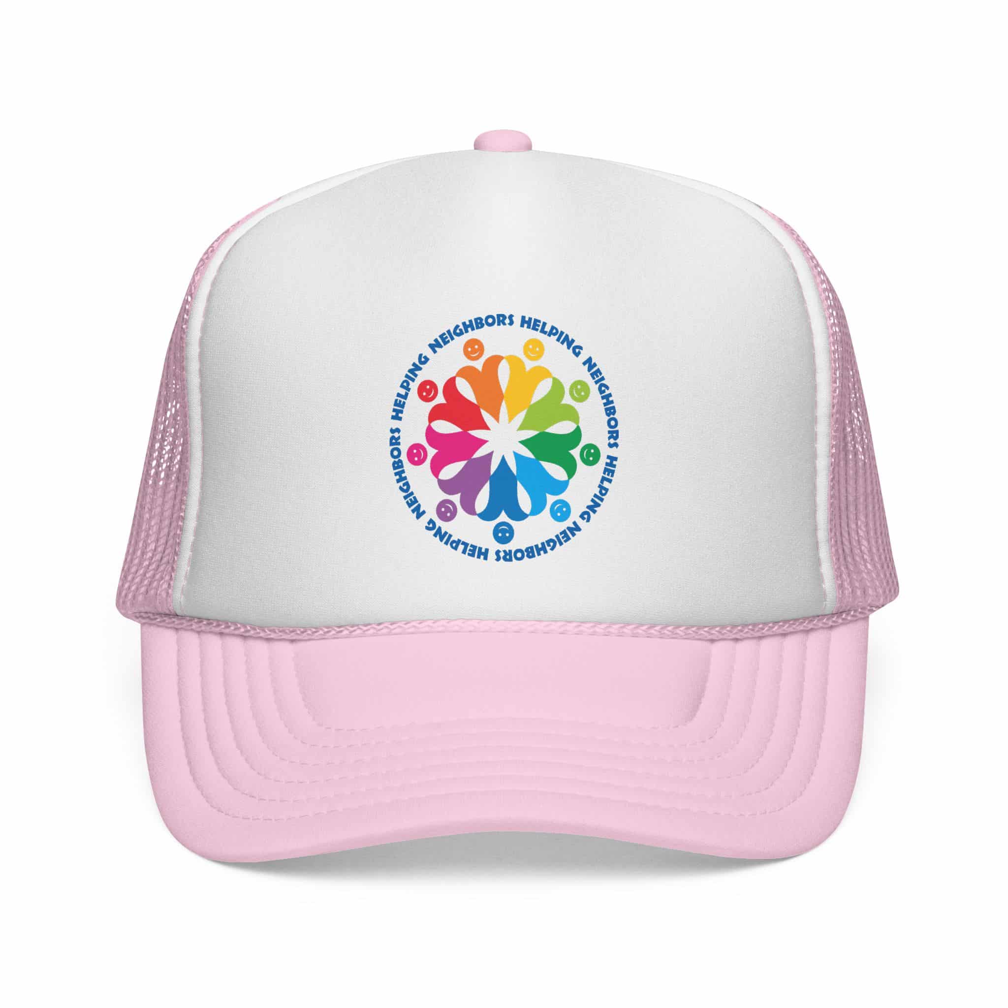 The design consists of interlocking hearts that look like a circle of people with interlocked arms – complete with smiling faces. That the “people” are multi-colored is just an added bonus.