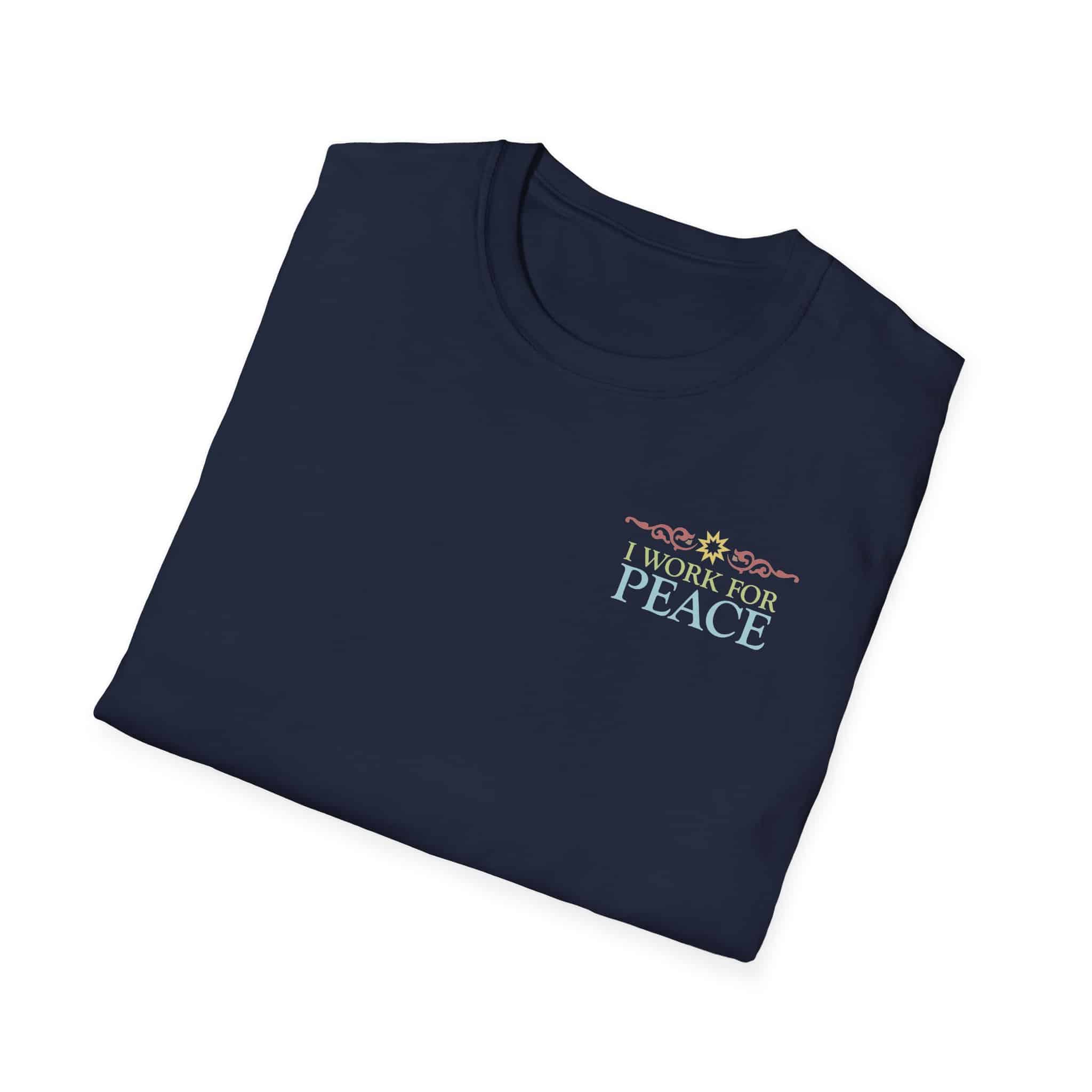 NOTE: The Black and Forest Green shirts only print on the BACK and are less expensive. The NAVY shirt includes the words “I work for peace” on the FRONT as well, and costs extra for the second print.