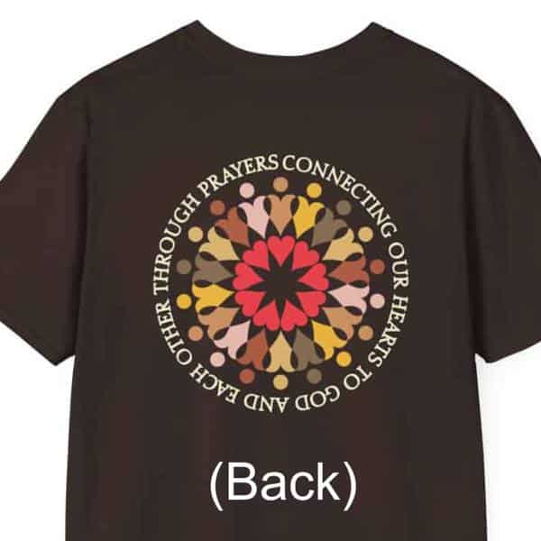 The interlocking hearts of this design create the illusion of a circle of people locking arms together in unity. And what creates that unity? “Prayers connecting our hearts to God and to each other.” The circular slogan reinforces the idea that it is through prayer that we find this unity.