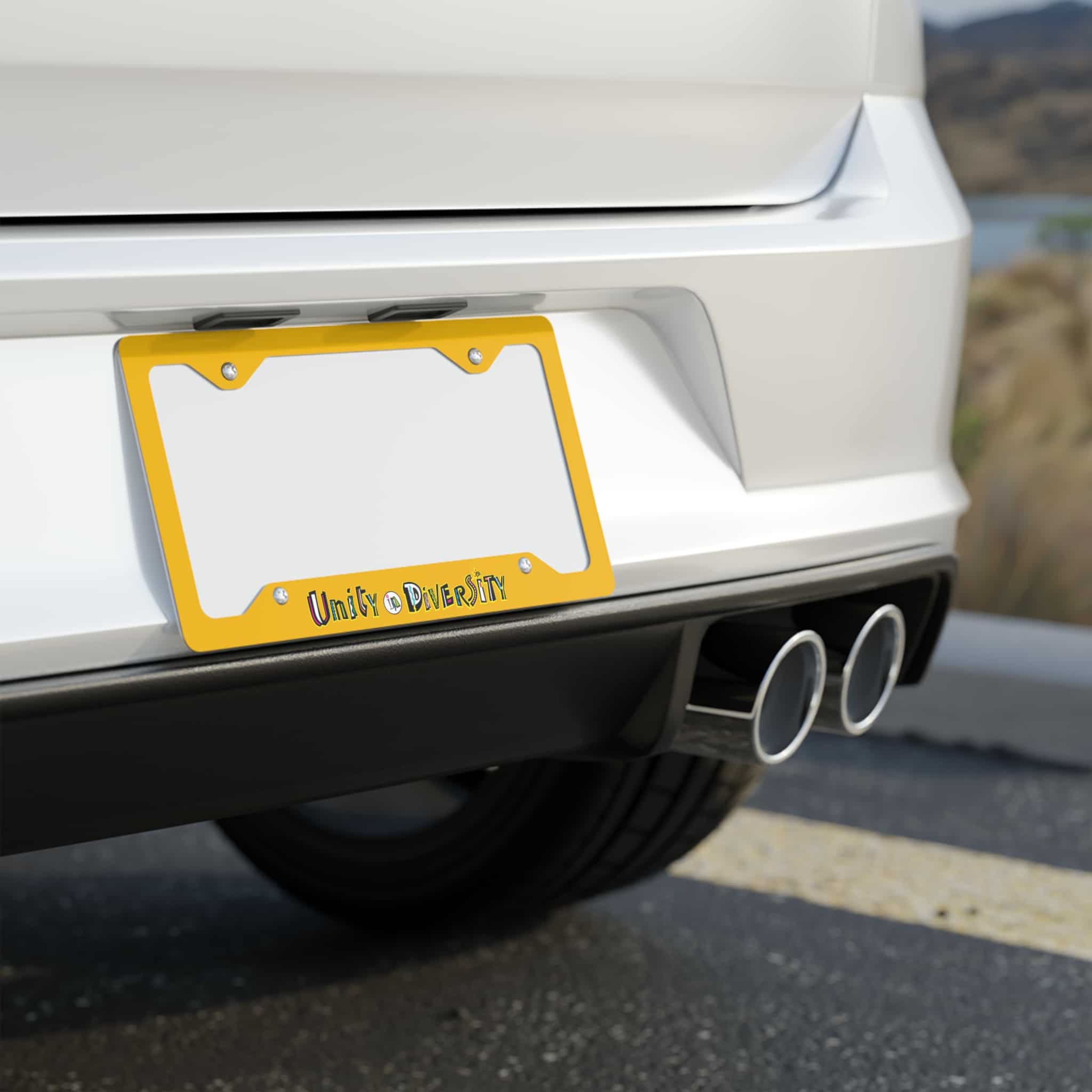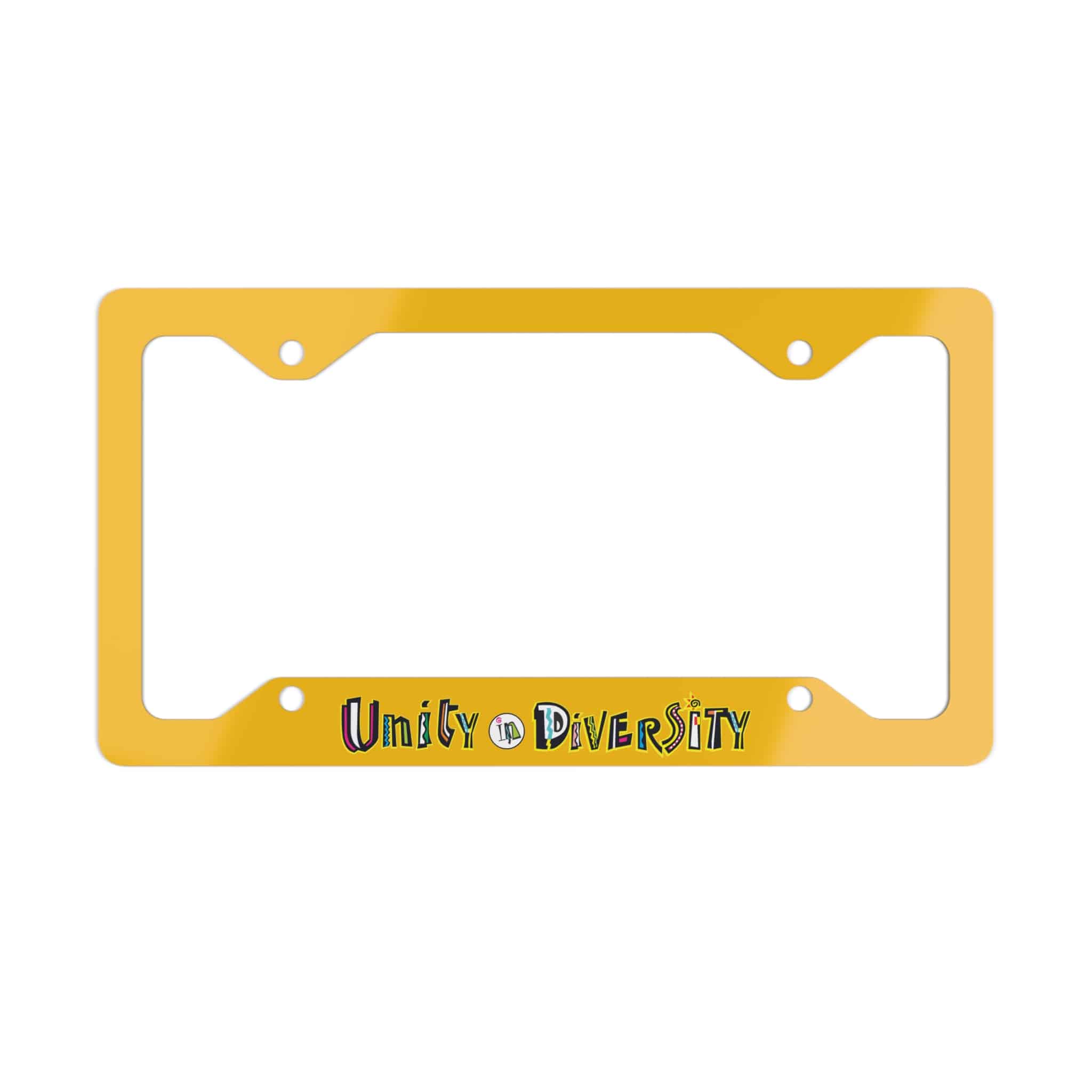 More elegant than a bumper sticker, this UNITY IN DIVERSITY license plate frame proclaims this important principle in a colorful quirky font.